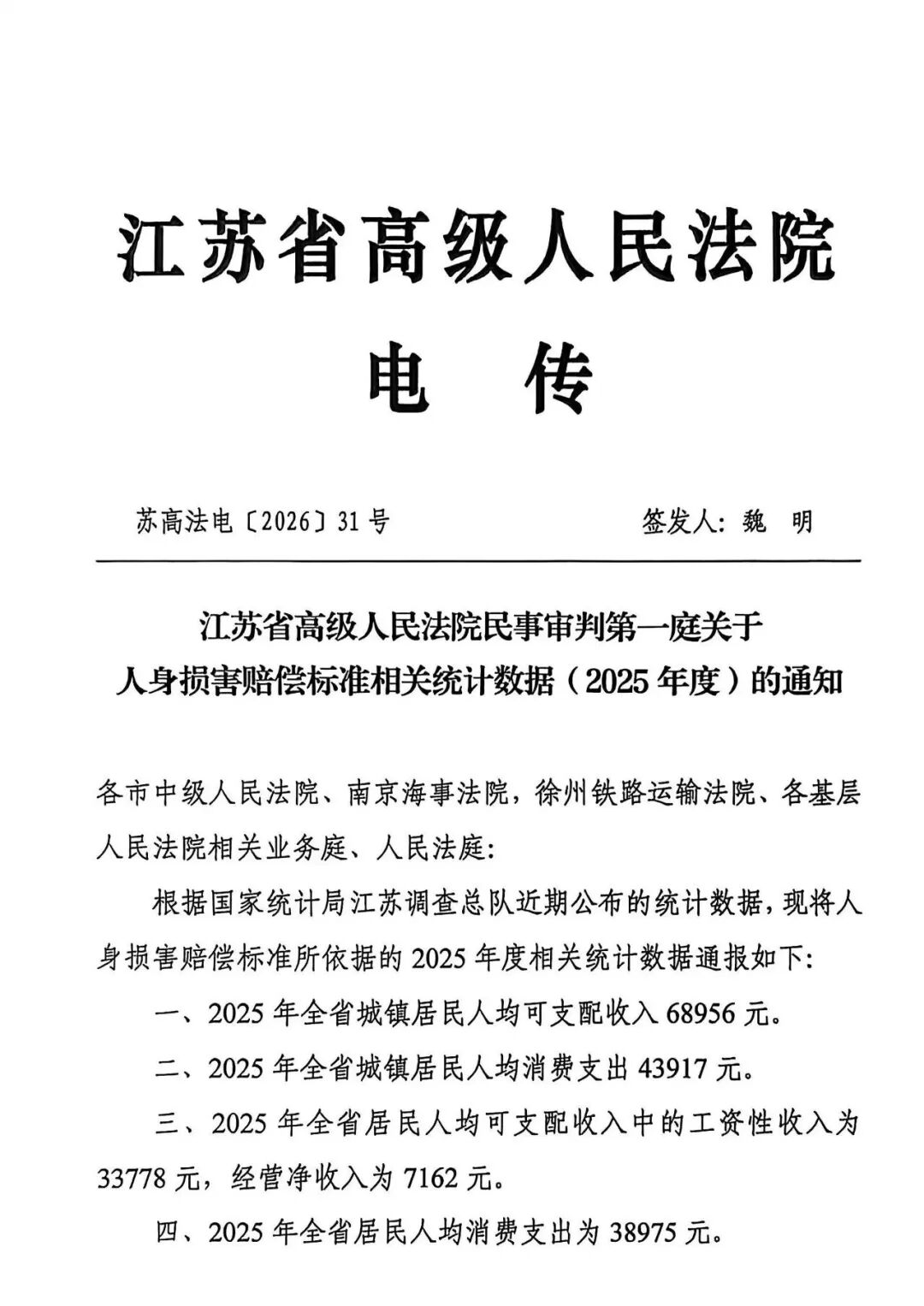 根据国家统计局江苏调查总队近期公布的统计数据,现将人身损害赔偿标准所依据的2025年度相关统计数据通报如下: